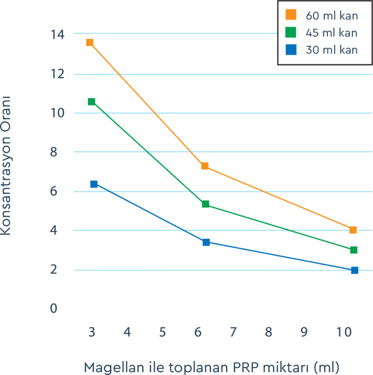 Bu, PRP içindeki her ml trombosit konsantrasyonunu ayarlamanızı sağlar. Magellan her kiti, maksimum 30 ml ürün verecek 3 döngü için onaylanmıştır.